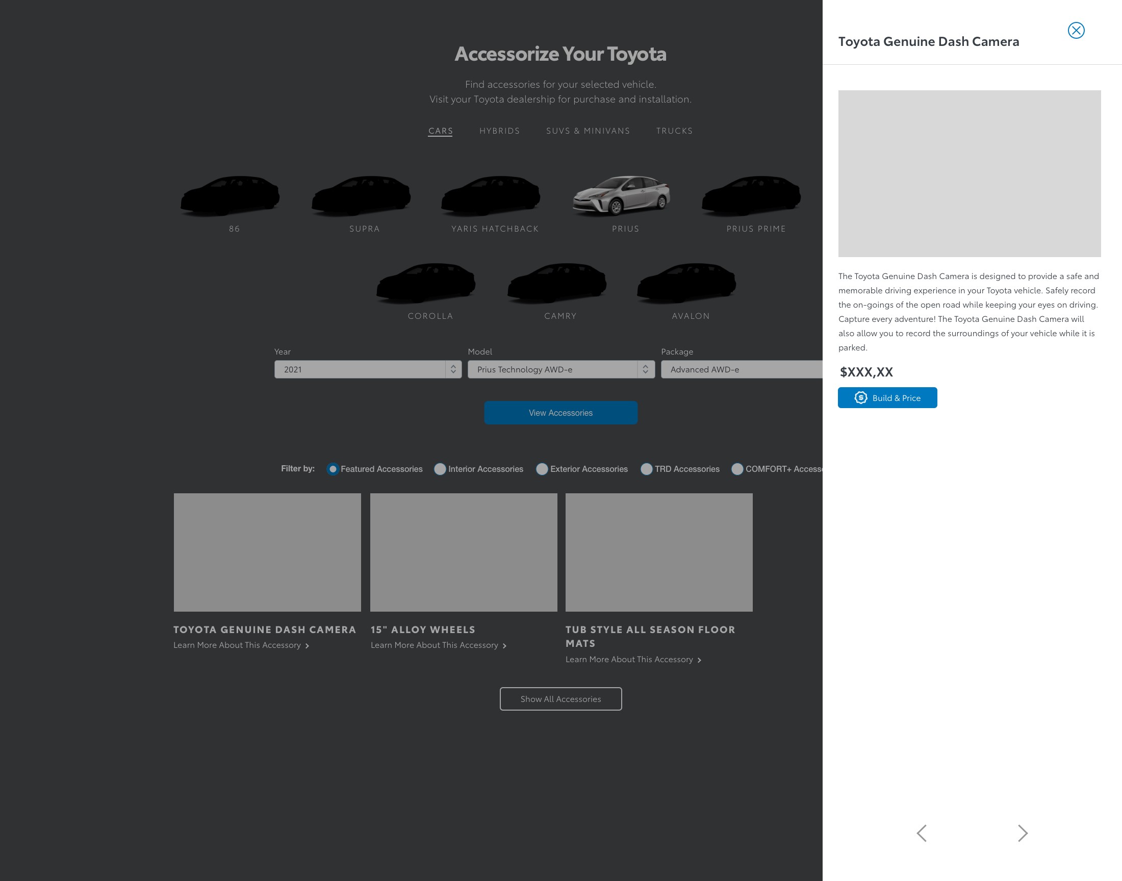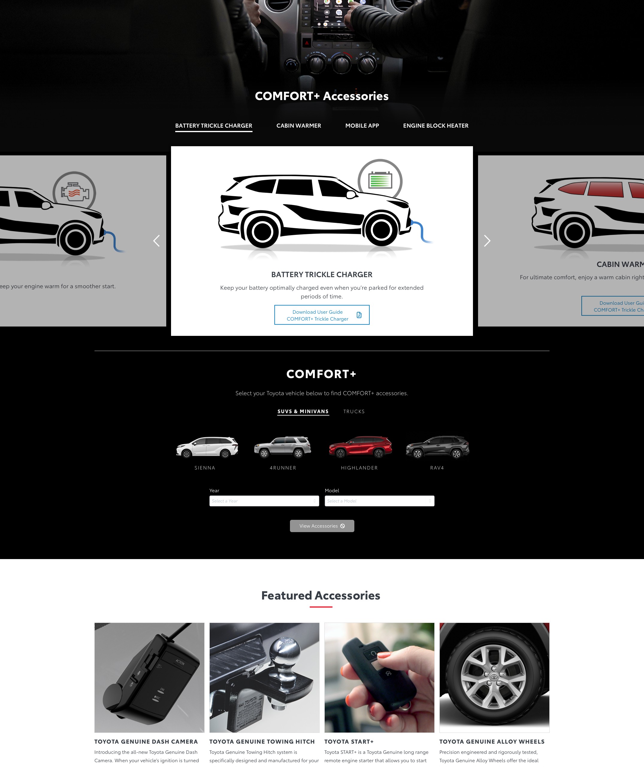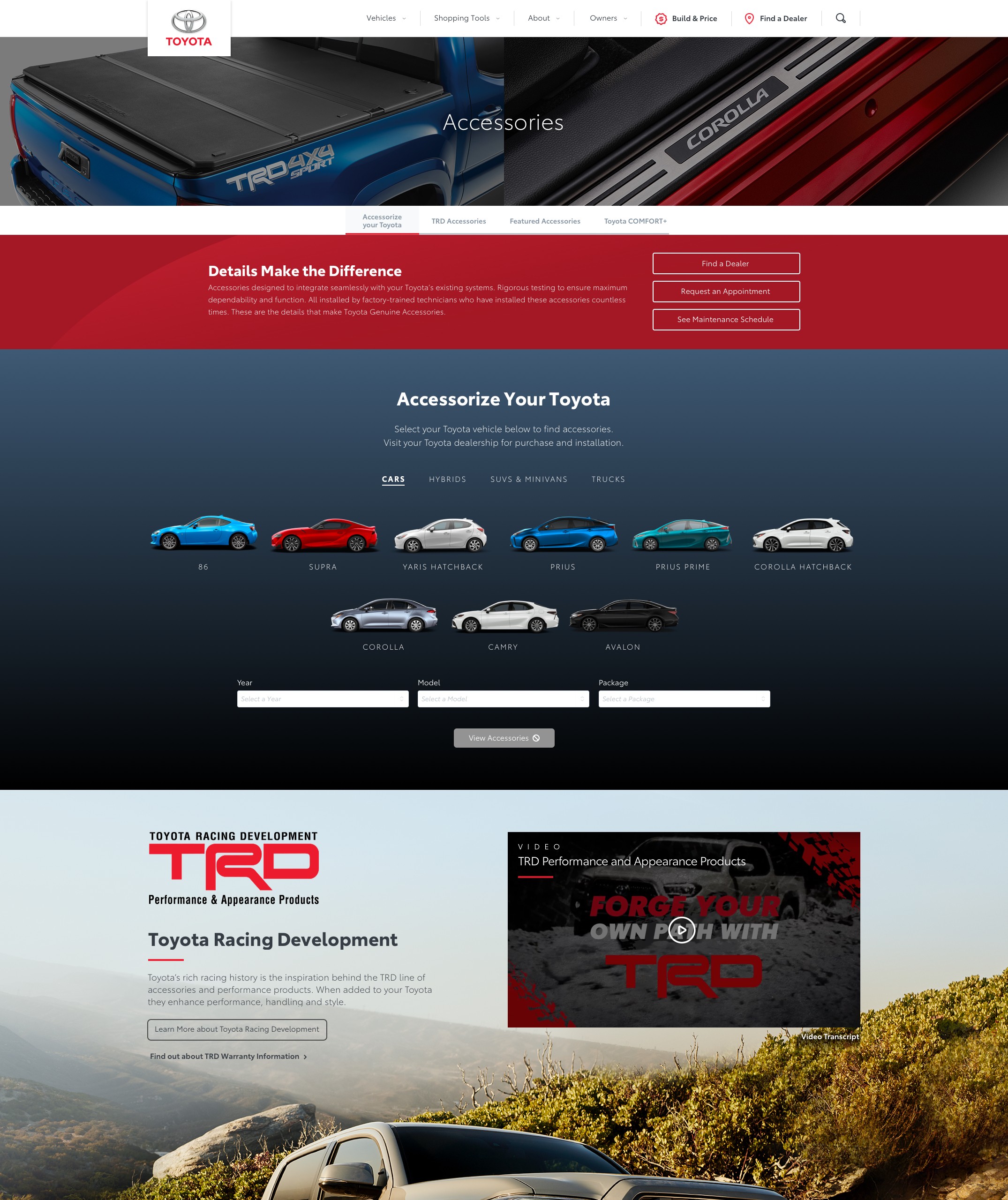Toyota aimed to reimagine its Accessories page by transforming it into a dynamic, search-forward experience. The existing experience was static and outdated, lacking the interactivity and visual clarity that modern users expect.